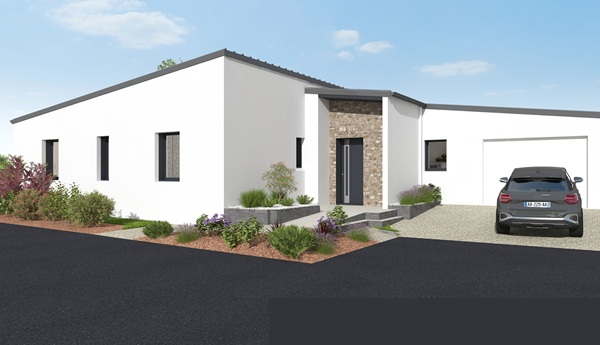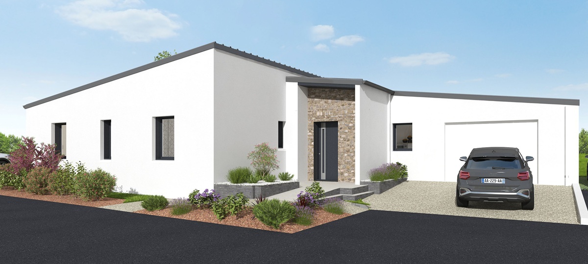 Maison bac acier avec parement pierre sous le porche d’entrée